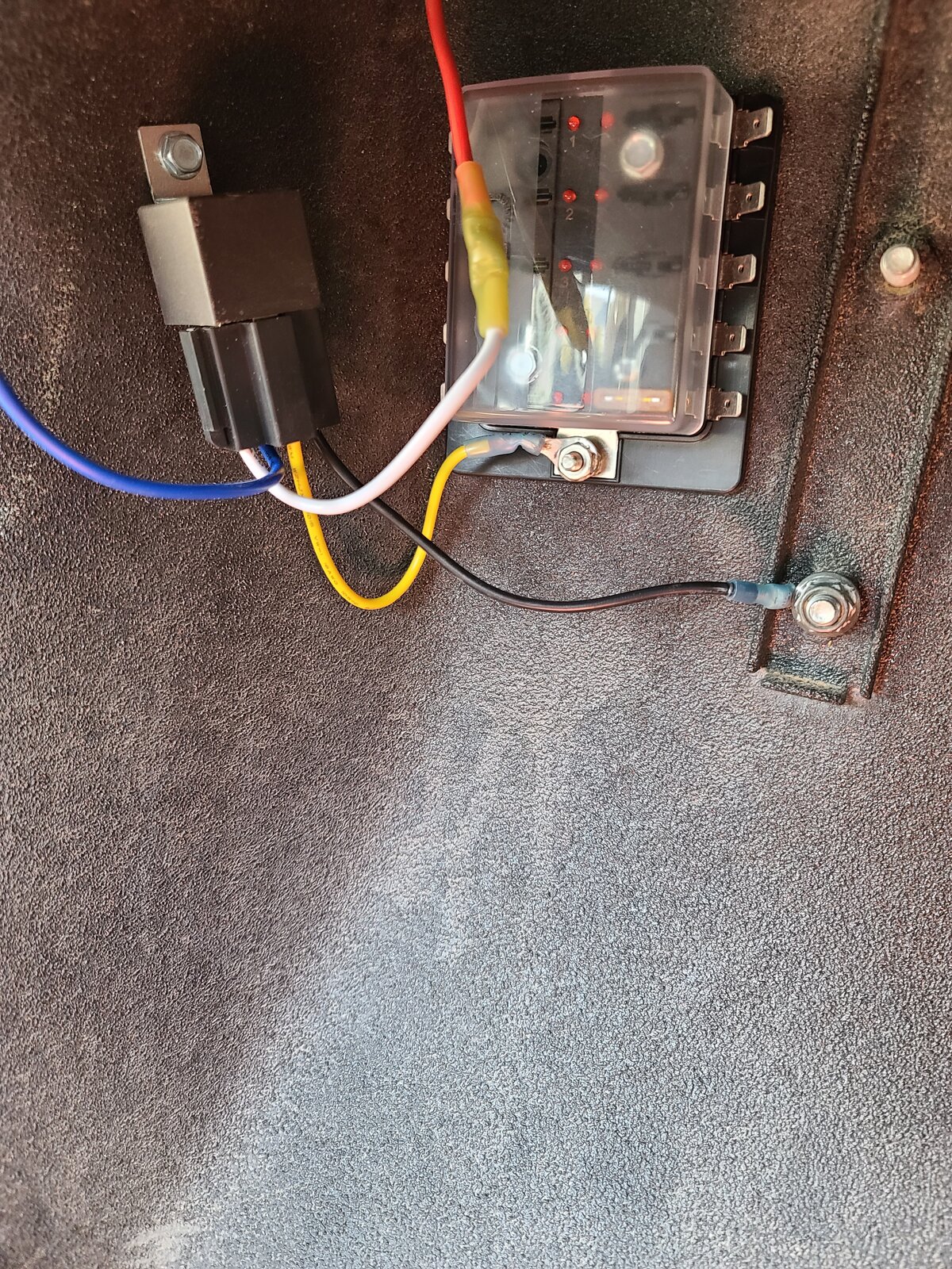 Wired up an aux fuse box up under the dash. Don't mind the loose wires. They are going to get zip tied up shortly. Good news is it works and I didn't burn down the Roxor!