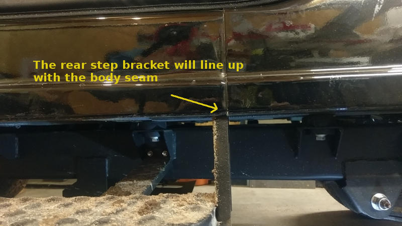 With the frame bracket attached to the frame, hold the step in place to the underside of the floor. The rear side bracket will line up very close to being in line with one of the body seams. Refer to the image.