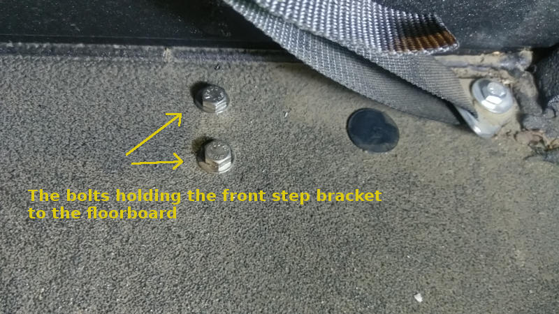 Once you have the step positioned properly, mark the holes on the underside of the floor for the step brackets. Remove the frame bracket from the frame and drill all four holes on each side under the floor. Use a 5/16 drill bit if you are accurate or 11/32 to allow for slight repositioning. Use 5/16 x 1 inch bolts. Then reattach the frame bracket and install the bolts for the step brackets. Tighten all nuts and bolts and you are finished.