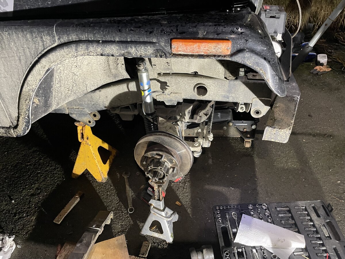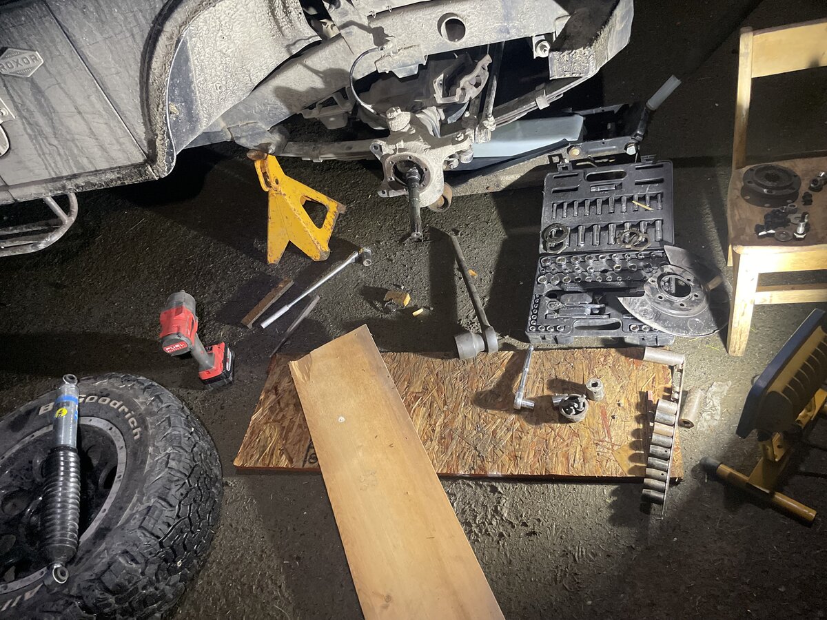 Changed spindle seals and bushings and started installing my new shocks. While I was there I noticed my leaf spring shackles seemed a bit off. Pressed out the bushing from my original spring and replaced the shot ones.
